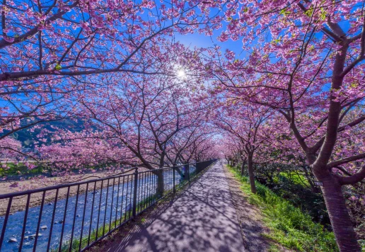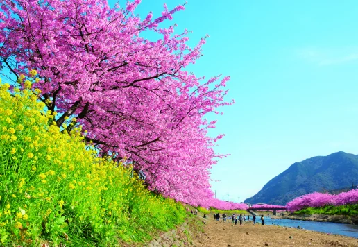 2月になると伊豆半島では、日本でもいち早く春を告げる「河津桜」が開花します。 例年2月上旬から咲きはじめ、2月中旬〜3月上旬にかけて見頃が続き、河津町の「河津桜まつり」では約850本もの桜並木が川沿いを彩ります。 昼の...