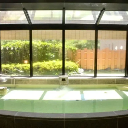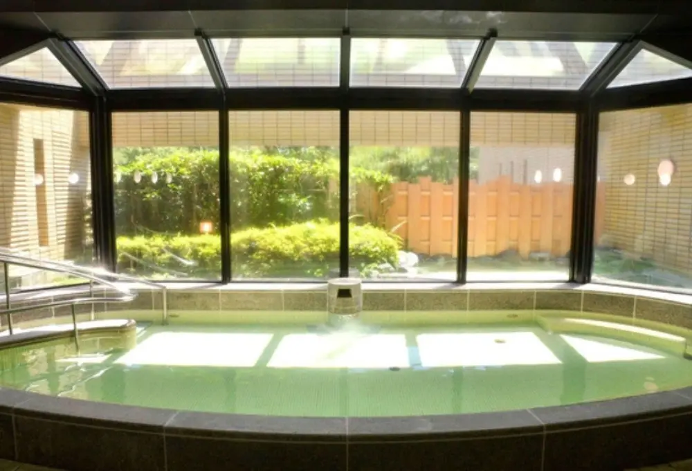 温泉に浸かりながら、木々の緑が映える伊豆高原の風景を眺め、